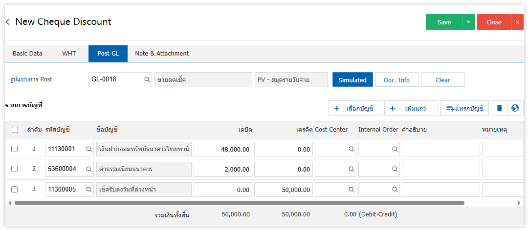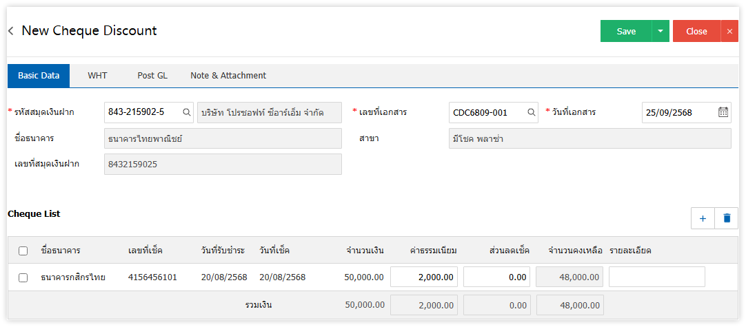 ตัวอย่างการบันทึกขายลดเช็คบนโปรแกรมบัญชีออนไลน์ myAccount cloud