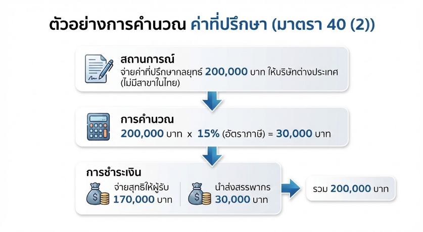 บริษัทไทยว่าจ้างบริษัทต่างประเทศให้บริการที่ปรึกษาด้านกลยุทธ์ธุรกิจ โดยมีค่าบริการตามสัญญา 200,000 บาท เนื่องจากเป็นเงินได้ตามมาตรา 40 (2) และผู้รับมิได้ประกอบกิจการในประเทศไทย จึงต้องหักภาษี ณ ที่จ่ายในอัตราร้อยละ 15