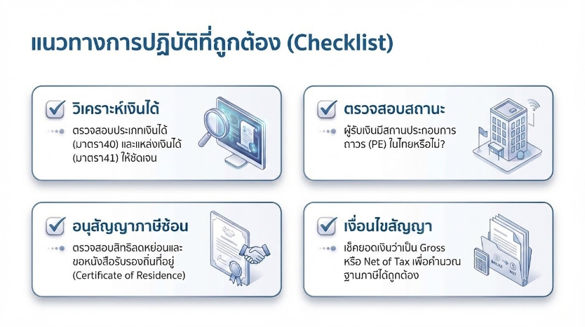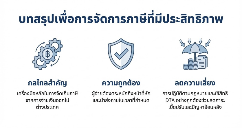 ผู้จ่ายเงินในประเทศไทยต้องตระหนักถึงหน้าที่ในการหักและนำส่งภาษีอย่างถูกต้องภายในกำหนดเวลา พร้อมทั้งพิจารณาสิทธิประโยชน์ตามอนุสัญญาภาษีซ้อนอย่างรอบคอบ การปฏิบัติที่สอดคล้องกับบทบัญญัติกฎหมายและแนวทางของกรมสรรพากร จะช่วยลดความเสี่ยงทางภาษี และสนับสนุนการดำเนินธุรกรรมระหว่างประเทศให้เป็นไปอย่างมั่นคงและโปร่งใส