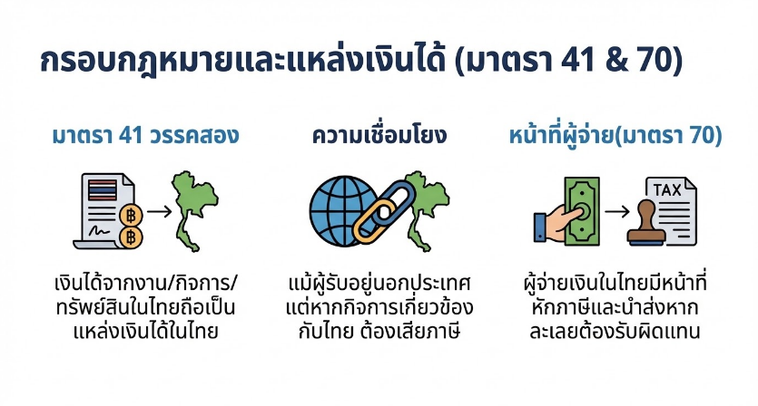 • มาตรา 41 วรรคสอง วางหลักเกณฑ์เกี่ยวกับแหล่งเงินได้ในประเทศไทย