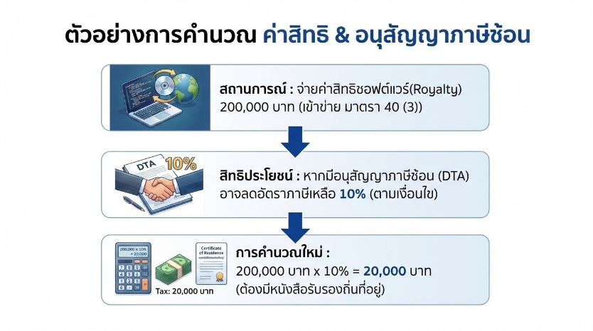 บริษัทไทยจ่ายค่าสิทธิในการใช้ซอฟต์แวร์แก่บริษัทต่างประเทศ จำนวน 200,000 บาท ซึ่งเข้าลักษณะมาตรา 40 (3) โดยหลักทั่วไป ต้องหักภาษีในอัตราร้อยละ 15 ตามมาตรา 70 อย่างไรก็ดี หากประเทศของผู้รับมีอนุสัญญาเพื่อการเว้นการเก็บภาษีซ้อนกับประเทศไทย และกำหนดให้อัตราภาษีสูงสุดสำหรับค่าสิทธิไม่เกินร้อยละ 10 ผู้จ่ายเงินอาจใช้อัตราดังกล่าวได้