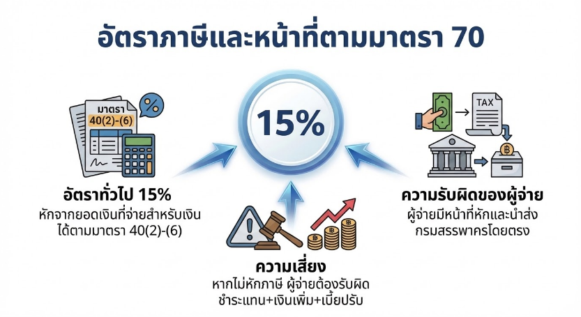 มาตรา 70 บัญญัติว่า เมื่อมีการจ่ายเงินได้ตามมาตรา 40 (2) (3) (4) (5) หรือ (6) ให้แก่บริษัทหรือห้างหุ้นส่วนนิติบุคคลที่ตั้งขึ้นตามกฎหมายต่างประเทศ และมิได้ประกอบกิจการในประเทศไทย ให้ผู้จ่ายเงินหักภาษี ณ ที่จ่ายในอัตราร้อยละ 15 ของจำนวนเงินที่จ่าย เว้นแต่กรณีที่กฎหมายกำหนดไว้เป็นอย่างอื่น
