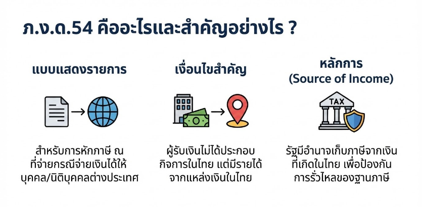 ภ.ง.ด.54 เป็นกลไกสำคัญในระบบภาษีอากรของประเทศไทยที่ใช้บังคับกับการจ่ายเงินได้ไปต่างประเทศ โดยอาศัยหลักเกณฑ์ตามมาตรา 40 มาตรา 41 และมาตรา 70 แห่งประมวลรัษฎากร