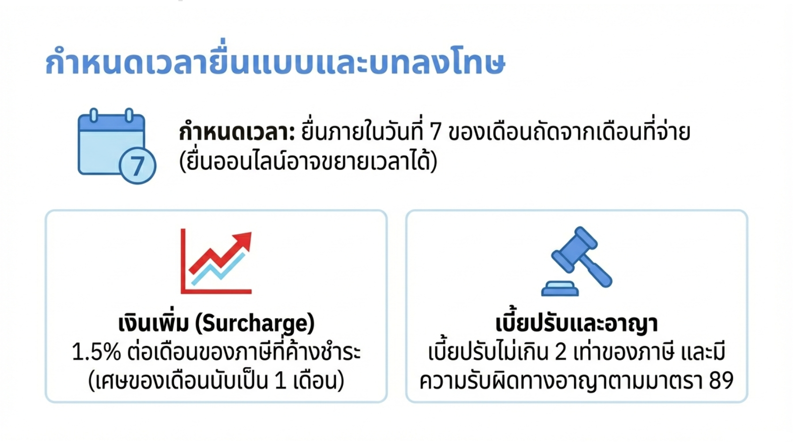 • เงินเพิ่มในอัตราร้อยละ 1.5 ต่อเดือนของภาษีที่ค้างชำระ (เศษของเดือนนับเป็นหนึ่งเดือน)