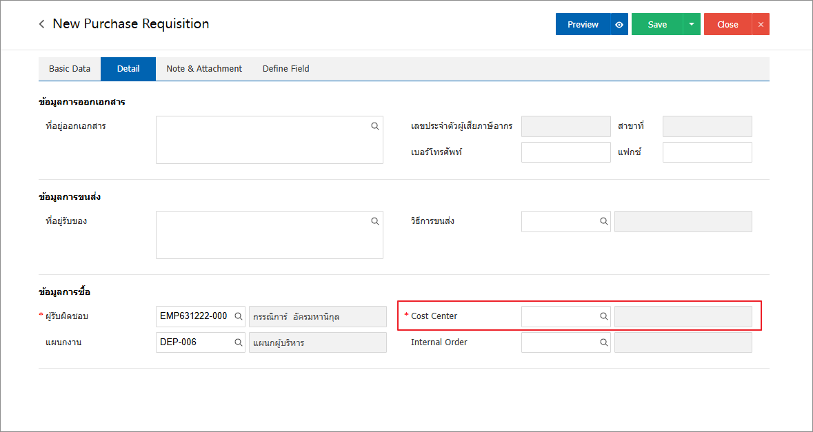 ตัวอย่างหน้าเอกสาร Purchase Requisition หน้าระบุ Cost Center