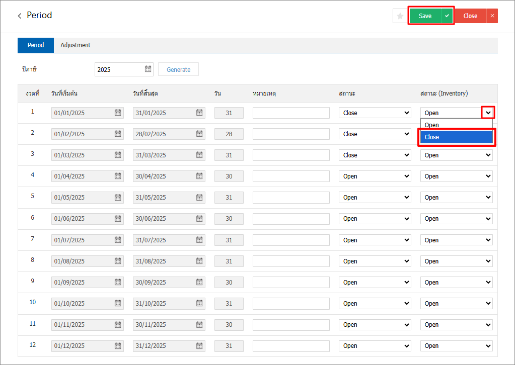 2. ใน Tab Period จะแสดงคอลัมน์สถานะ ซึ่งหากผู้ใช้ต้องการปิดงวดบัญชีเกี่ยวกับสต็อกสามารถกดปุ่มสามเหลี่ยมที่คอลัมน์ “สถานะ(Inventory)” > เลือก Close > เสร็จแล้วให้กดปุ่ม save ได้เลย