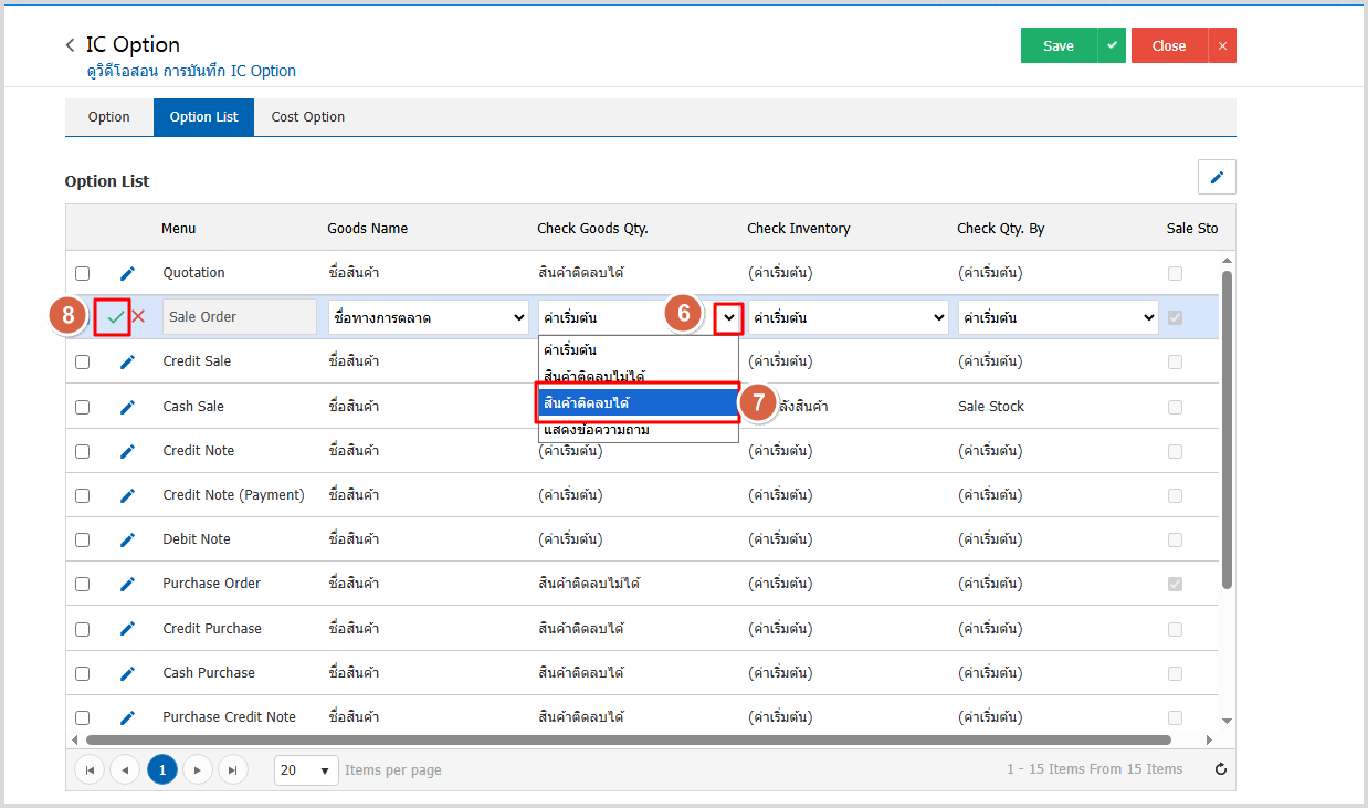 4. กดเลือกลูกศรที่ช่อง Check Good Qty. > สินค้าติดลบได้ > กดเช็คถูกสีเขียวหน้าเมนูที่ตั้งค่า