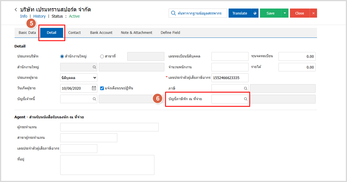 3. จากนั้นให้กดที่ Tab Detail > บัญชีภาษีหัก ณ ที่จ่าย > กดรูปแว่นขยายเพื่อเลือกรหัสบัญชีภาษีหัก ณ ที่จ่ายสำหรับเจ้าหนี้รายนี้