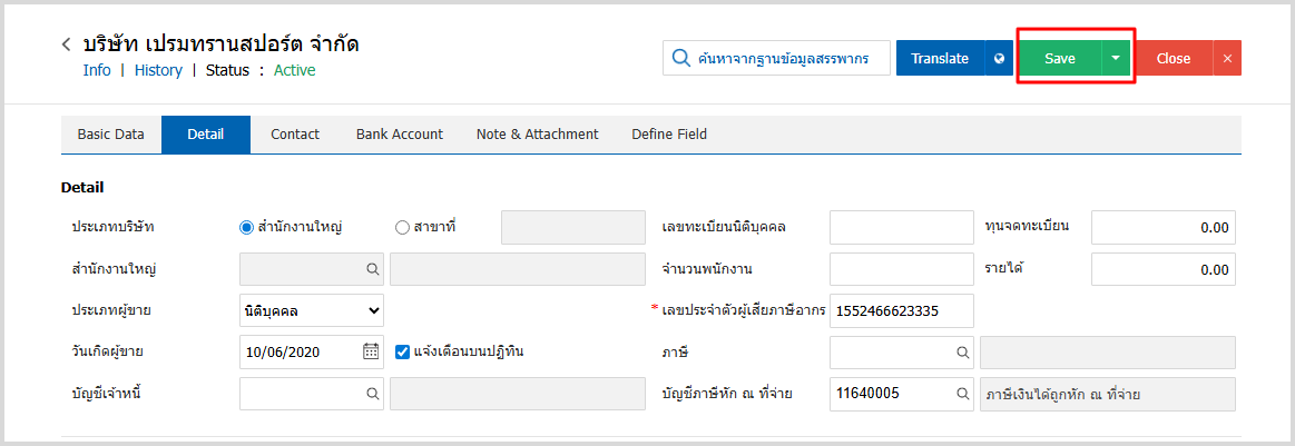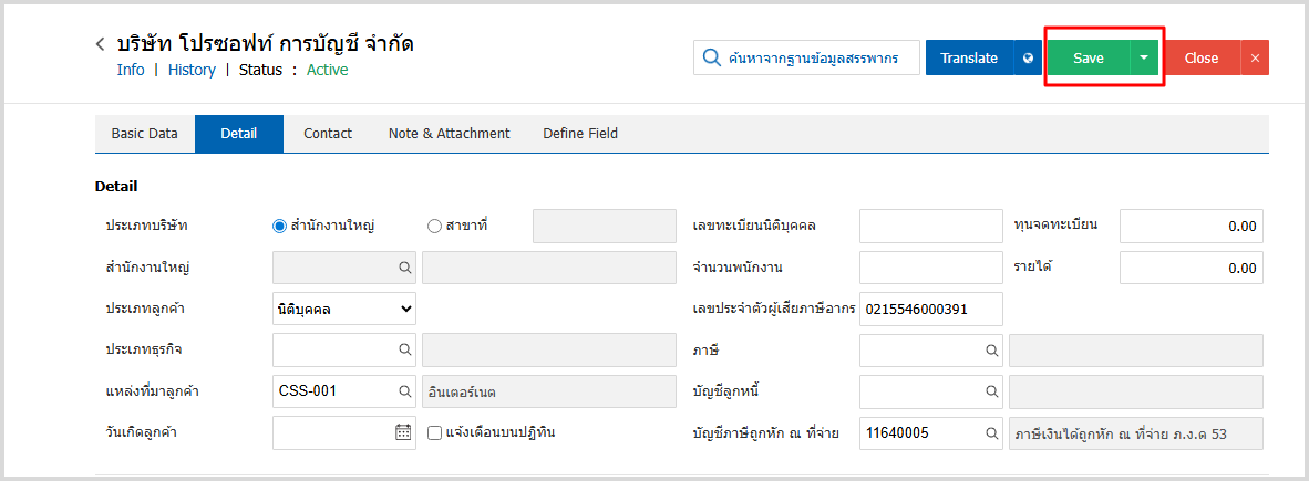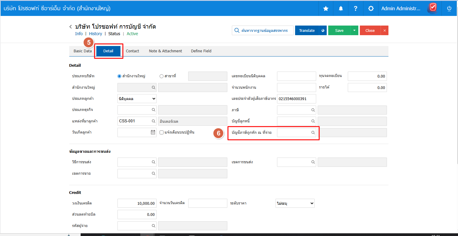 3. จากนั้นให้กดที่ Tab Detail > บัญชีภาษีถูกหัก ณ ที่จ่าย > กดรูปแว่นขยายเพื่อเลือกรหัสบัญชีภาษีถูกหัก ณ ที่จ่ายสำหรับลูกหนี้รายนี้