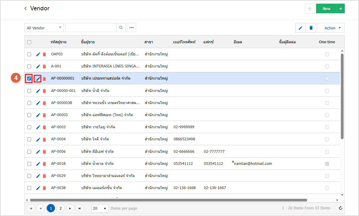 2. จากนั้นให้กดติ๊กเช็คถูกและกดรูปปากกาแก้ไขหน้ารหัสเจ้าหนี้ที่ต้องการจะผูกผังบัญชีภาษีหัก ณ ที่จ่าย หรือหากต้องการสร้างรหัสเจ้าหนี้ใหม่ให้กดปุ่ม NEW