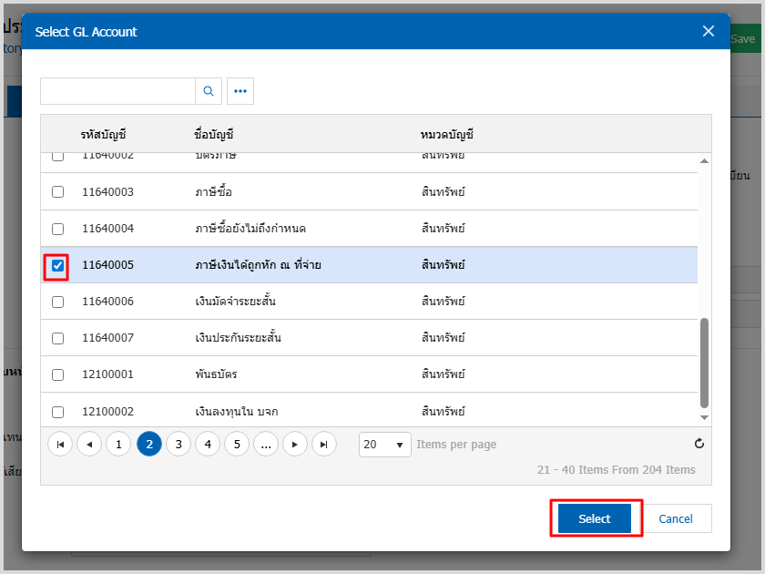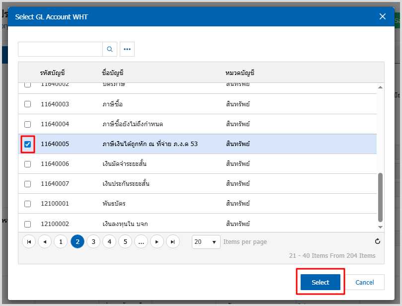 3.1. เลือกรหัสบัญชีภาษีถูกหัก ณ ที่จ่าย แล้วกดปุ่ม Select