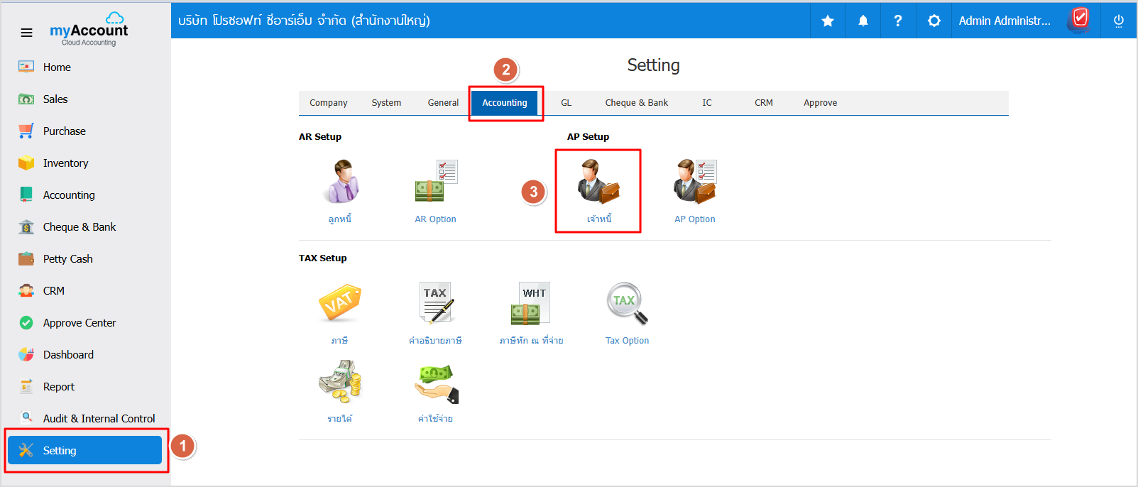 1. ให้ผู้ใช้ไปที่การตั้งค่า Setting > Accounting > เจ้าหนี้