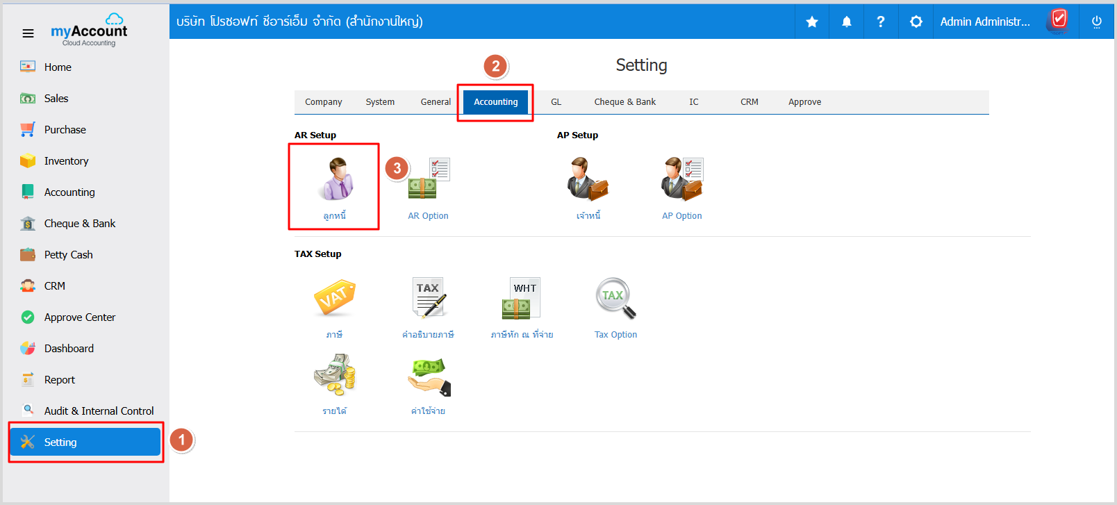 1. ให้ผู้ใช้ไปที่การตั้งค่า Setting > Accounting > ลูกหนี้