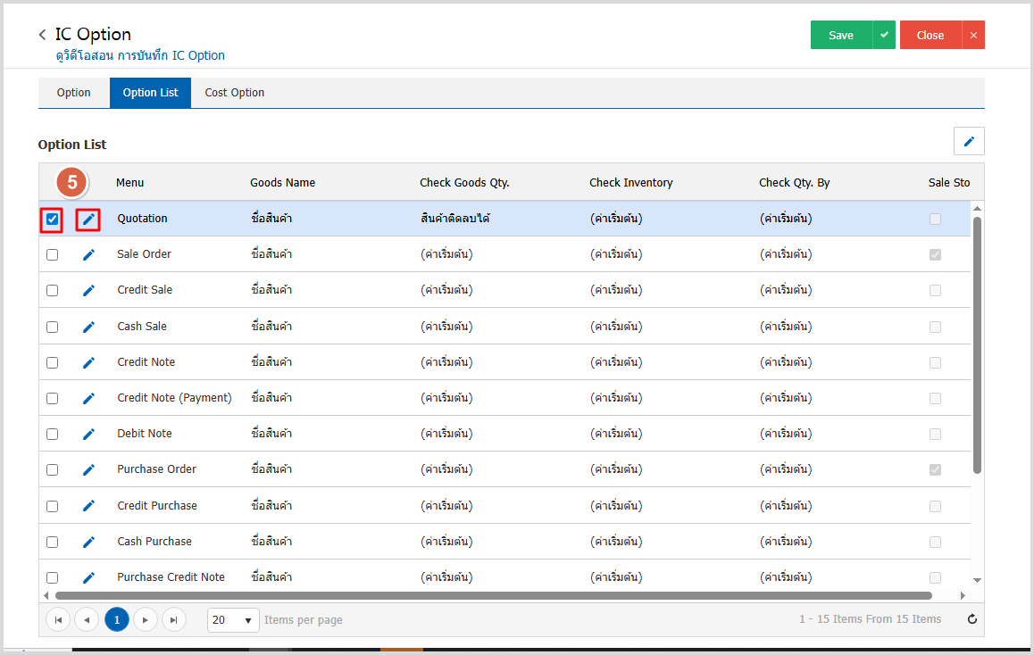 3. ให้เลือกเมนูที่ต้องการเรียกใช้งานชื่อสินค้าทางการตลาดหรือชื่อสินค้าในการออกบิล กดติ๊กเช็คถูกที่ช่องและกดรูปปากกาแก้ไข