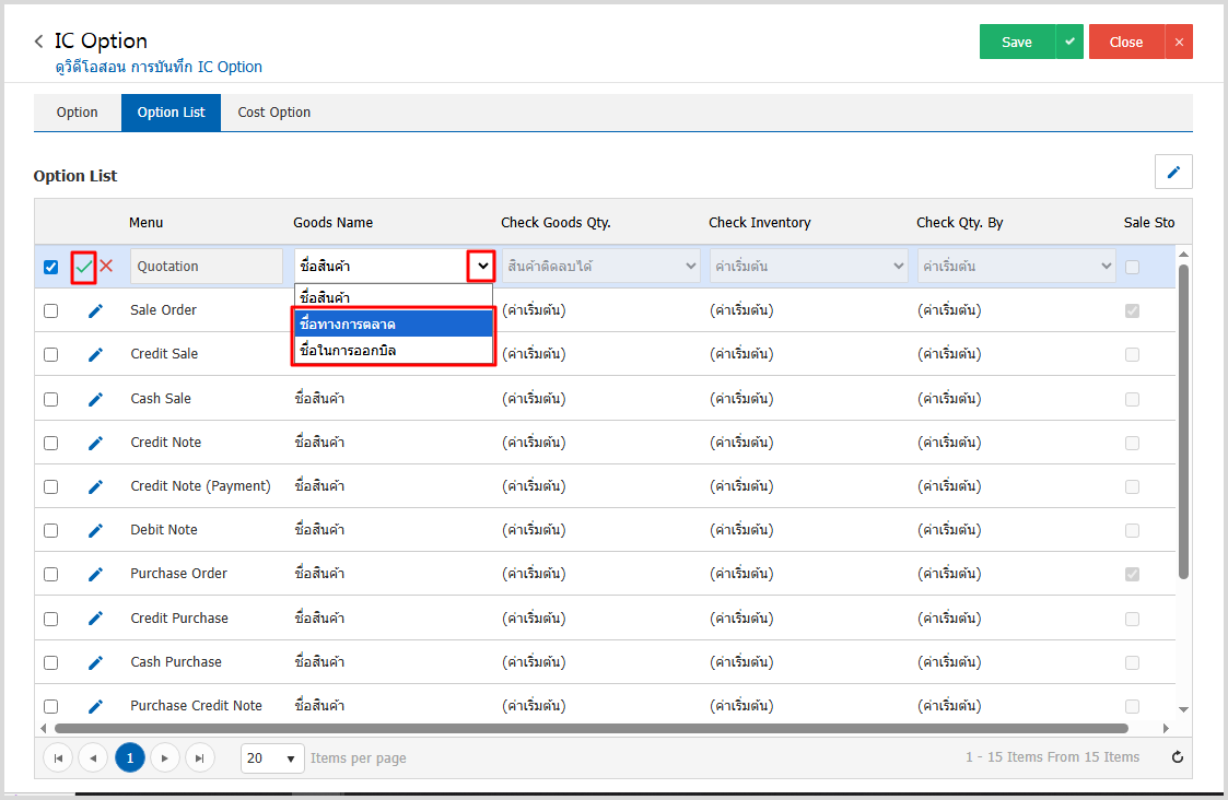 4. กดเลือกลูกศรที่ช่อง Goods Name > ชื่อทางการตลาดหรือชื่อสินค้าในการออกบิล > กดเช็คถูกสีเขียวหน้าเมนูที่ตั้งค่า
