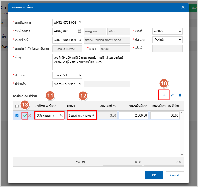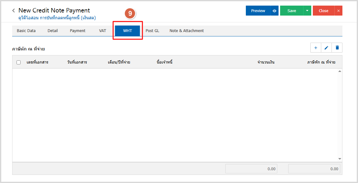 8.ใน Tab WHT คือ การบันทึกภาษีหัก ณ ที่จ่าย ใช้ในกรณีที่มีภาษีหัก ณ ที่จ่าย โดยกดปุ่ม “ + ” ระบบจะ แสดงหน้าต่างการบันทึกข้อมูลภาษีหัก ณ ที่จ่าย ขึ้นมา ผู้ใช้ควรทำการกรอกข้อมูลในฟอร์มที่มีเครื่องหมาย “ * ” ให้ครบถ้วน จากนั้นกดปุ่ม “ + ” เพื่อเป็นการสร้างรายการภาษีหัก ณ ที่จ่าย ให้ผู้ใช้ “เลือกประเภท ภาษี” > เลือกมาตรา” > ระบุจำนวนเงินที่จ่าย กดติ๊กเช็คถูกสีเขียว > เพื่อเป็นการบันทึกข้อมูล ดังรูป