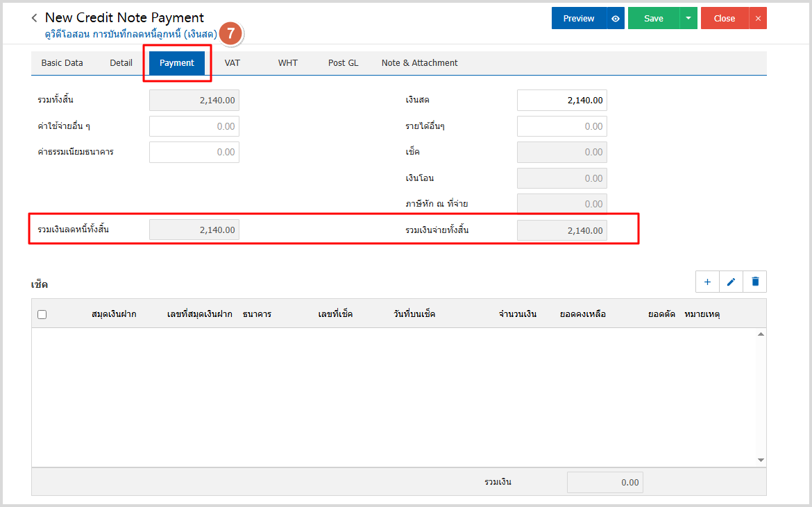 6.จากนั้นไป Tab Payment คือ การบันทึกรายละเอียดวิธีการจ่ายชำระเงินสด โดยผู้ใช้ต้องบันทึกข้อมูลตามที่กิจการได้มีการจ่ายชำระเงิน ทั้งในรูปแบบเงินสด เช็ค หรือเงินโอน เป็นต้น และ “รวมเงินลดหนี้ทั้งสิ้น”