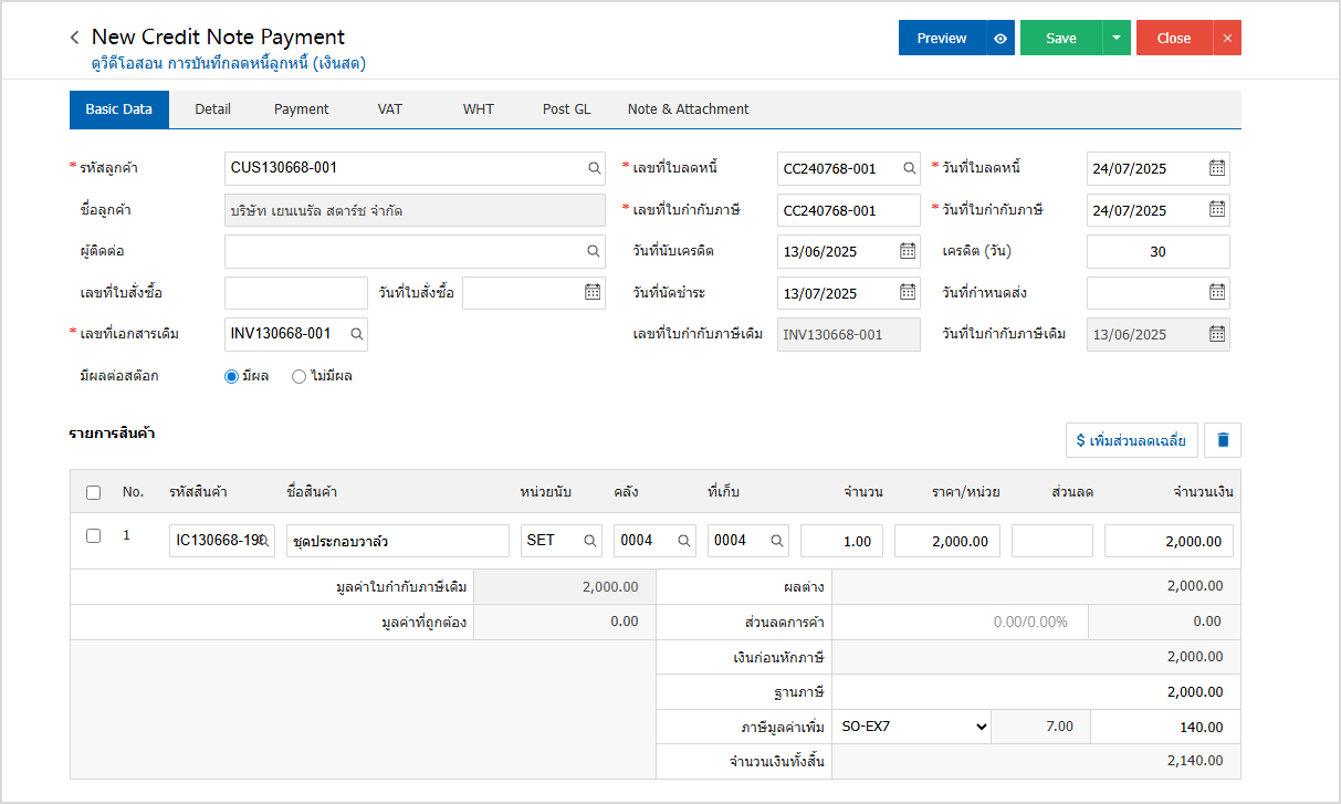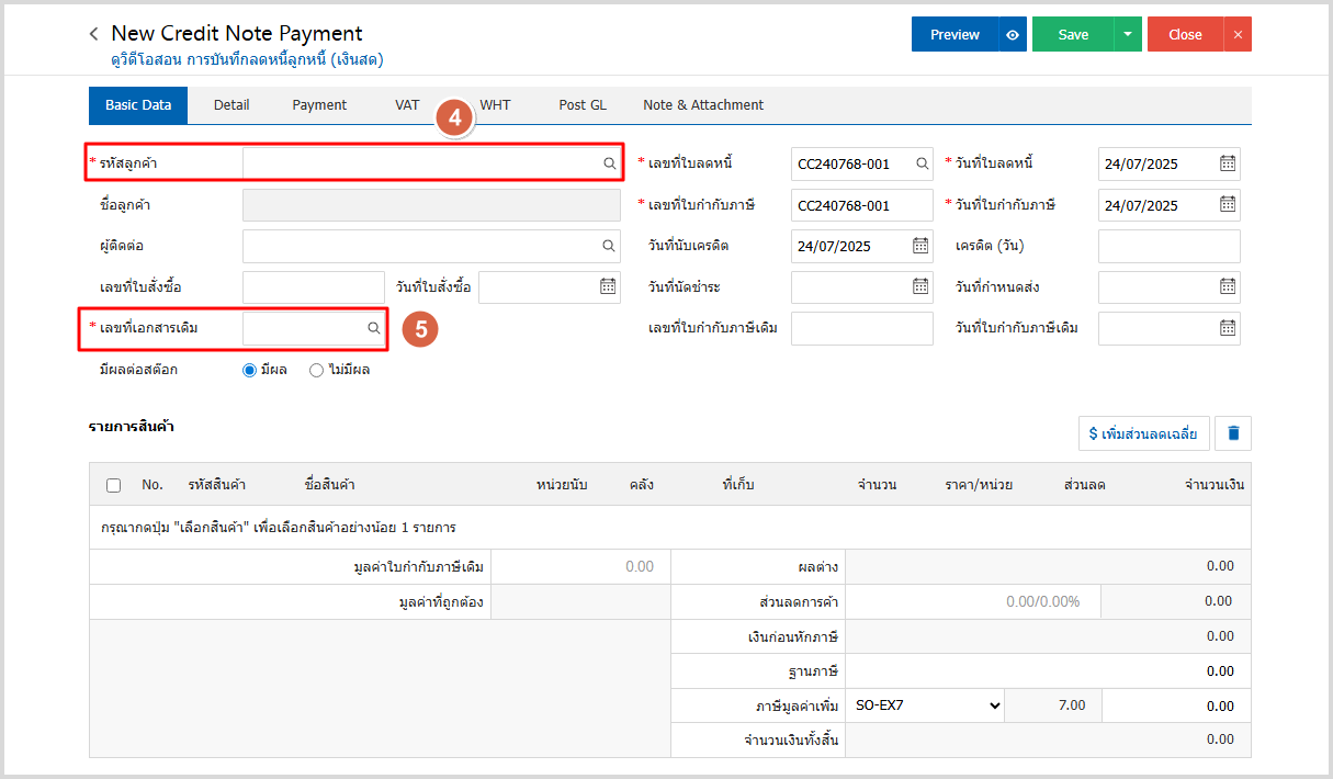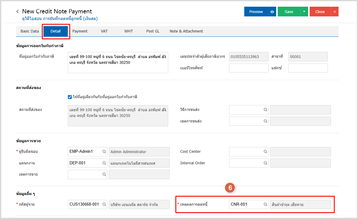 5.จากนั้นไปที่ Tab Detail โดยระบบจะอ้างอิงข้อมูลที่อยู่ของลูกค้าตามที่ผู้ใช้มีการตั้งค่าเริ่มต้น และให้ผู้ใช้ระบุเหตุผลการลดหนี้ ดังรูป
