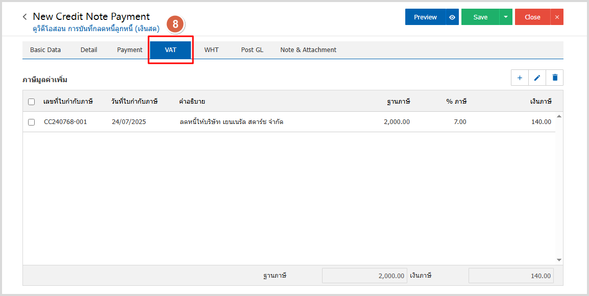 7.ใน Tab VAT คือ การบันทึกรายละเอียดภาษีมูลค่าเพิ่ม ระบบจะแสดงรายละเอียดภาษีมูลเพิ่ม ทันทีหลัก จากที่บันทึกข้อมูลแบบมีภาษี