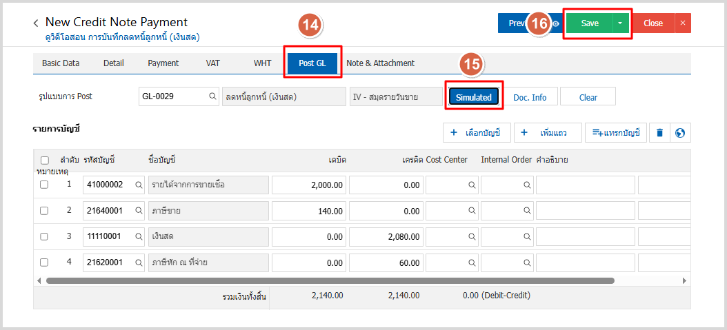 9.ใน Tab Post GL คือการบันทึกผ่านรายการ (Posting) ไปยังบัญชีแยกประเภท (General Ledger) ผู้ใช้ สามารถ Post GL โดยกดปุ่ม Simulated หลังจากผู้ใช้ตรวจสอบข้อมูลครบถ้วนแล้ว ให้กดปุ่ม Save ทางด้านขวาบนของหน้าจอโปรแกรม เพื่อเป็น การบันทึกข้อมูลเอกสารลดหนี้ลูกหนี้ (เงินสด)