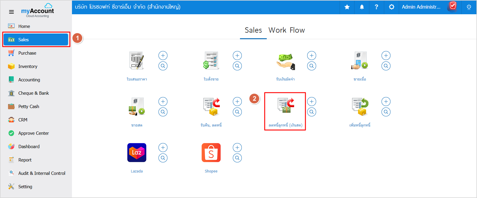 1.ให้ผู้ใช้ไปที่เมนู Sales  > ลดหนี้ลูกหนี้(เงินสด)