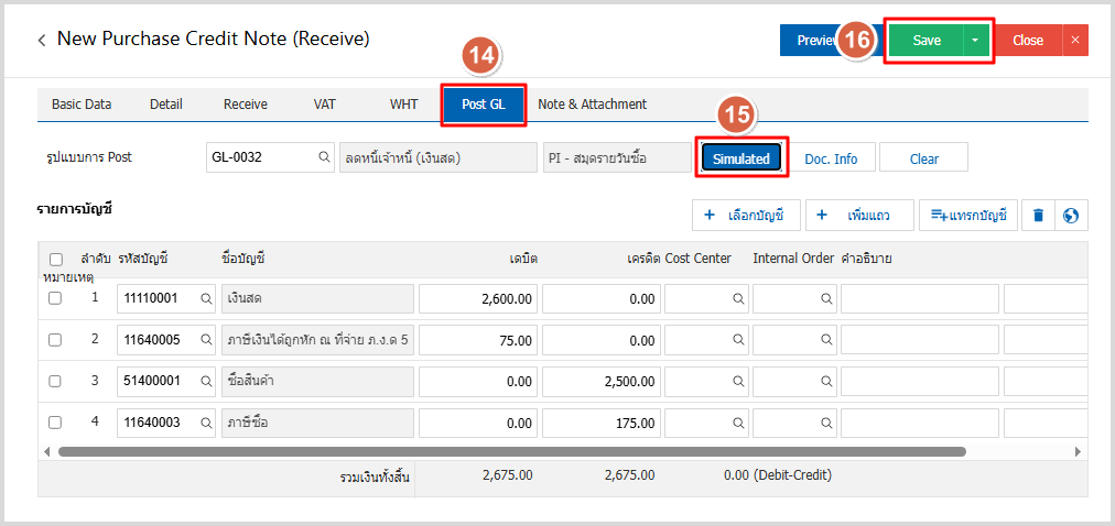 9.ใน Tab Post GL คือการบันทึกผ่านรายการ (Posting) ไปยังบัญชีแยกประเภท (General Ledger) ผู้ใช้ สามารถ Post GL โดยกดปุ่ม Simulated หลังจากผู้ใช้ตรวจสอบข้อมูลครบถ้วนแล้ว ให้กดปุ่ม Save ทางด้านขวาบนของหน้าจอโปรแกรม เพื่อเป็นการบันทึกข้อมูลเอกสารลดหนี้เจ้าหนี้ (เงินสด)