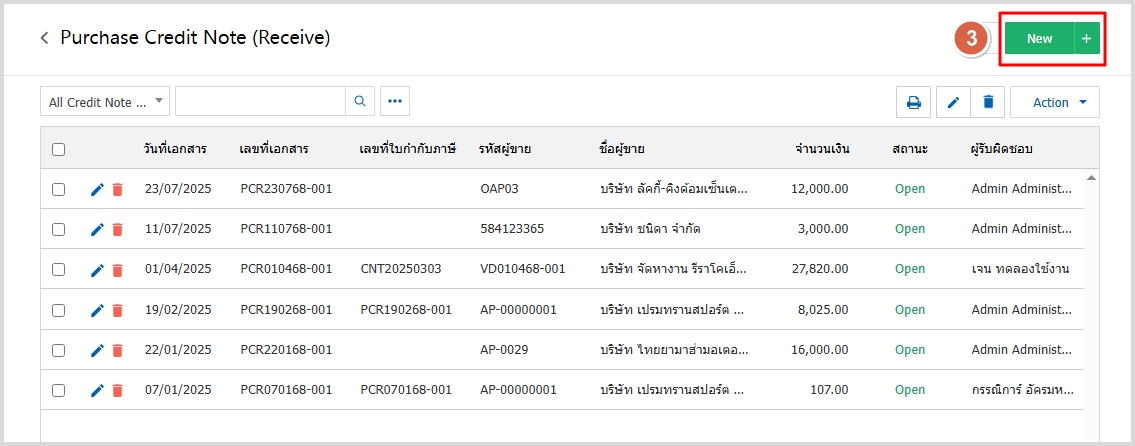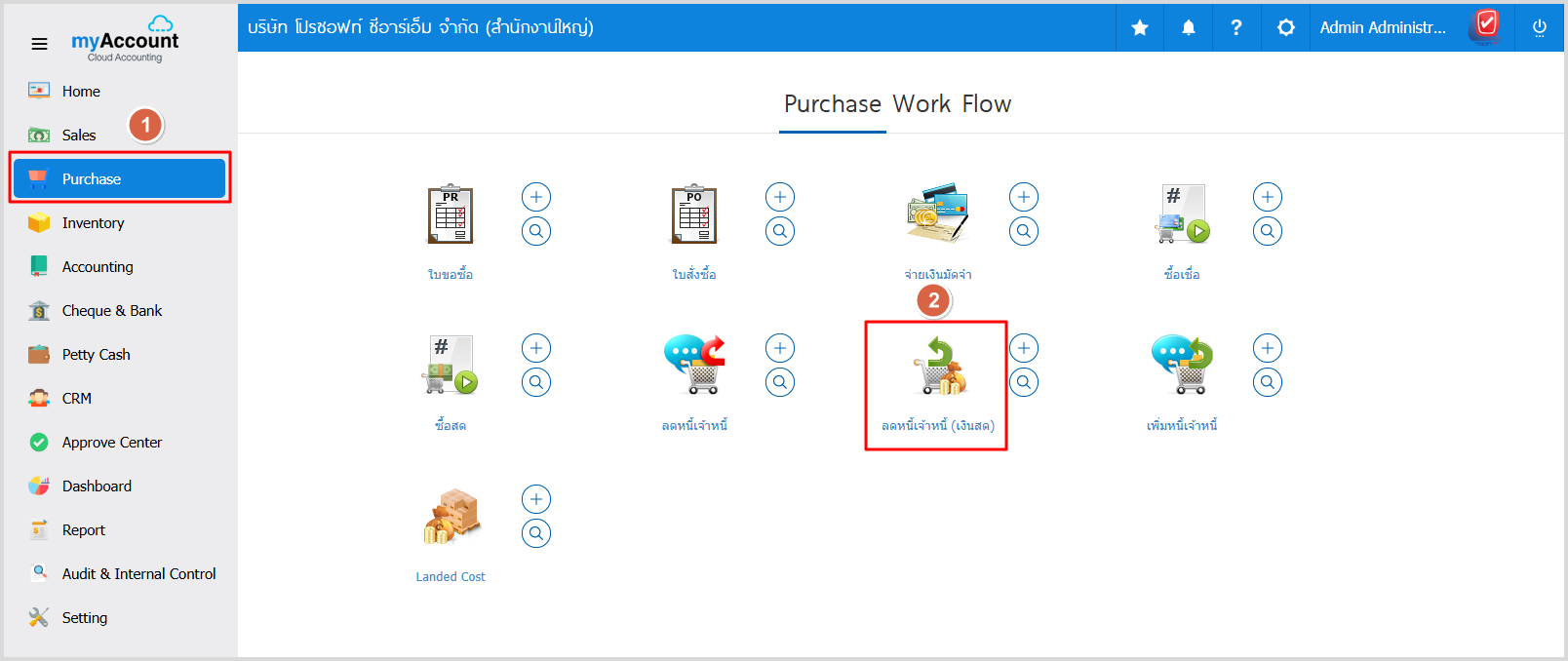 1.ให้ผู้ใช้ไปที่ Purchase > ลดหนี้เจ้าหนี้ (เงินสด)