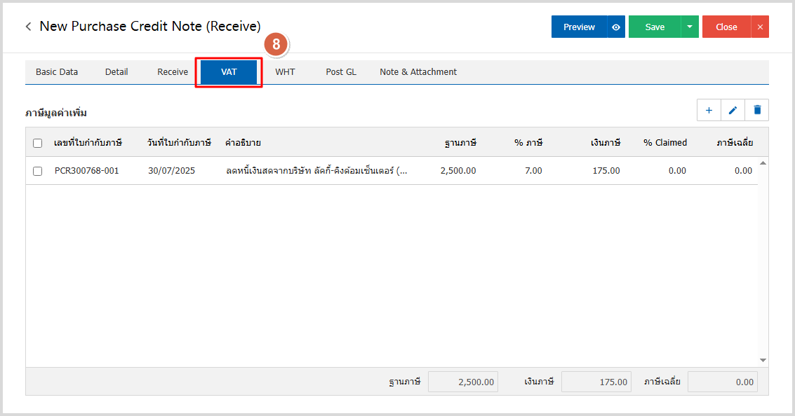 7.ใน Tab VAT คือ การบันทึกรายละเอียดภาษีมูลค่าเพิ่ม ระบบจะแสดงรายละเอียดภาษีมูลเพิ่ม ทันทีหลัก จากที่บันทึกข้อมูลแบบมีภาษี