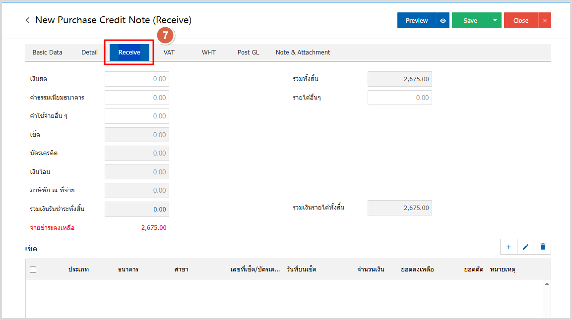 6.จากนั้นไป Tab Receive คือ การบันทึกการรับเงินคืน ซึ่งจะมียอดเงินแสดงจำนวนเงินที่ต้องได้รับคืน เป็นตัวสีแดง อยู่ด้านล่าง หากใส่ยอดเงินตามวิธีที่รับเงินคืนแล้ว ช่อง ”จ่ายชำระคงเหลือ” จะหายไป ซึ่งจะมีวิธีบันทึกการ รับเงินคืนอยู่ 3 วิธีคือ แบบเงินสด, เช็ค และเงินโอน