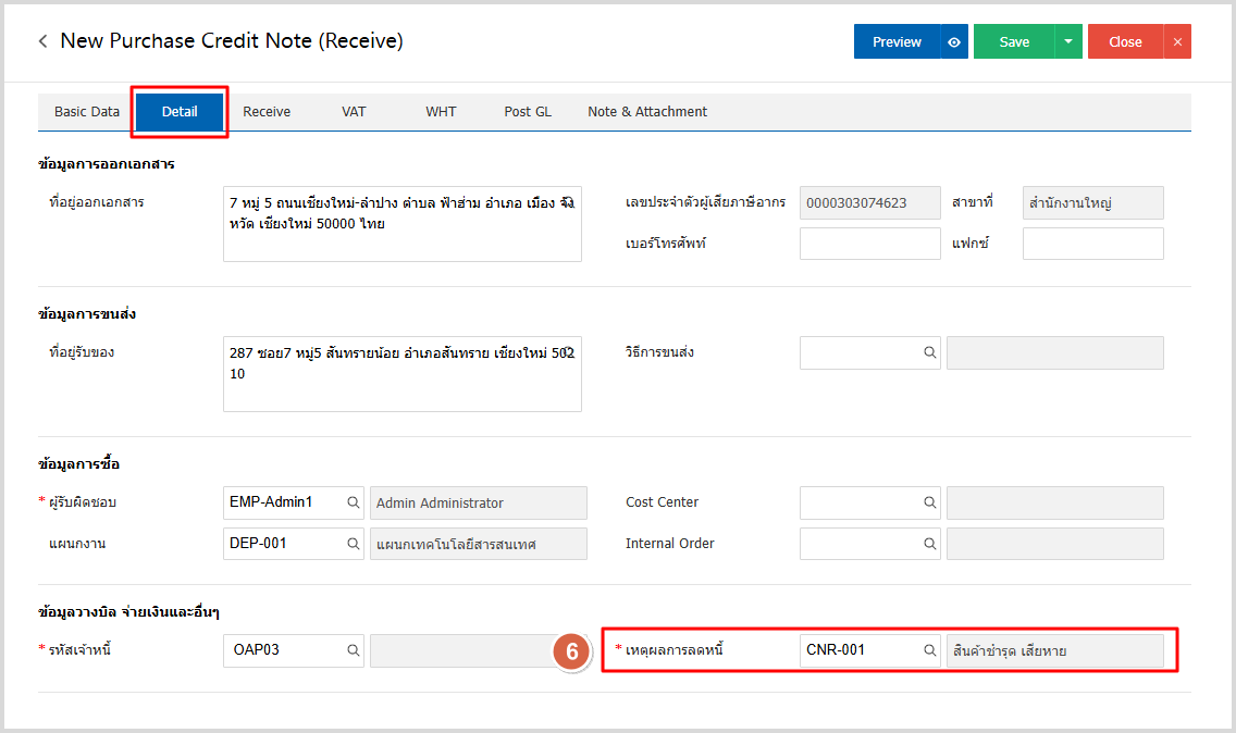 5.จากนั้นไปที่ Tab Detail โดยระบบจะอ้างอิงข้อมูลที่อยู่ของเจ้าหนี้ตามที่ผู้ใช้มีการตั้งค่าเริ่มต้นและให้ผู้ใช้ระบุเหตุผลการลดหนี้ ดังรูป
