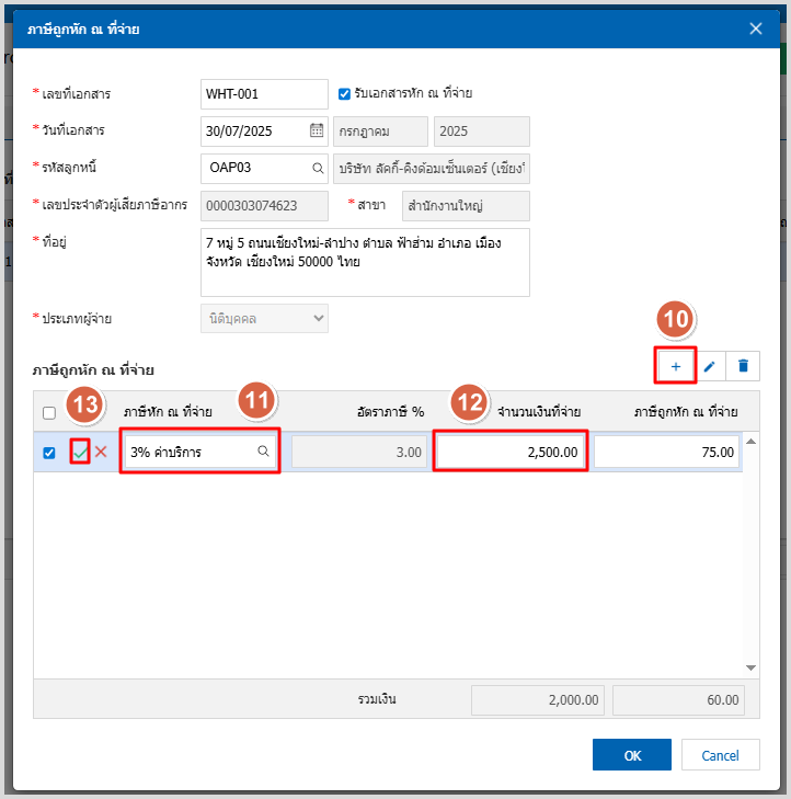 8.ใน Tab WHT คือ การบันทึกรายละเอียดภาษีถูกหัก ณ ที่จ่ายใช้ในกรณีที่มีภาษีถูกหัก ณ ที่จ่าย โดยกดปุ่ม “ + ” ระบบจะแสดงหน้าต่างการบันทึกข้อมูลภาษีถูกหัก ณ ที่จ่าย ขึ้นมา ผู้ใช้ควรทำการกรอกข้อมูลในฟอร์มที่มีเครื่องหมาย “ * ” ให้ครบถ้วน จากนั้นกดปุ่ม “ + ” เพื่อเป็นการสร้างรายการภาษีถูกหัก ณ ที่จ่าย ให้ผู้ใช้ “เลือกประเภท ภาษี” > ระบุจำนวนเงินที่จ่าย กดติ๊กเช็คถูกสีเขียว > เพื่อเป็นการบันทึกข้อมูล ดังรูป