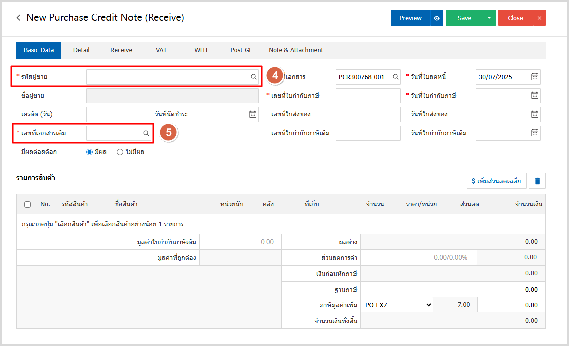 4.ระบบจะอ้างอิงข้อมูลของเอกสารซื้อเชื่อใบเดิมที่ต้องการจะลดหนี้ ดังรูป