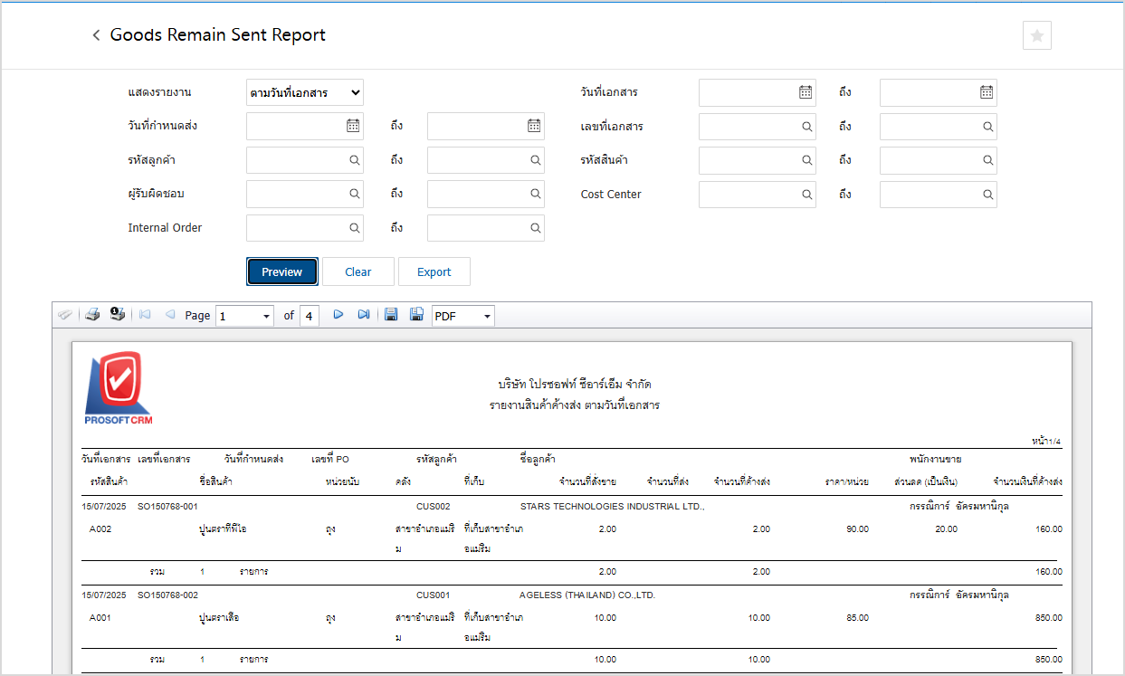 4.ให้ผู้ใช้เลือกการแสดงรายงานและการกรองข้อมูลที่ผู้ใช้ต้องการจากนั้นกด Preview ระบบจะแสดงจำนวนที่สั่งขาย, จำนวนที่ส่ง และจำนวนที่ค้างส่ง