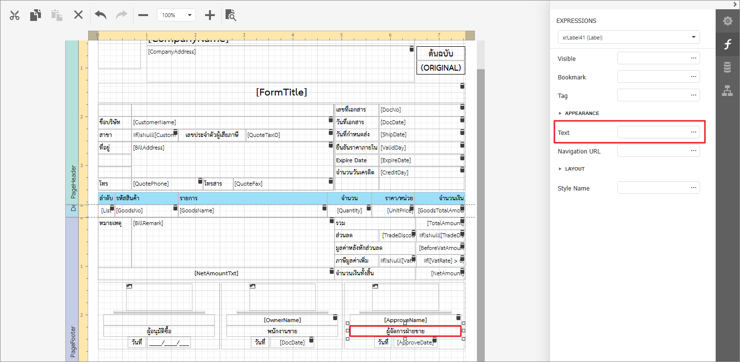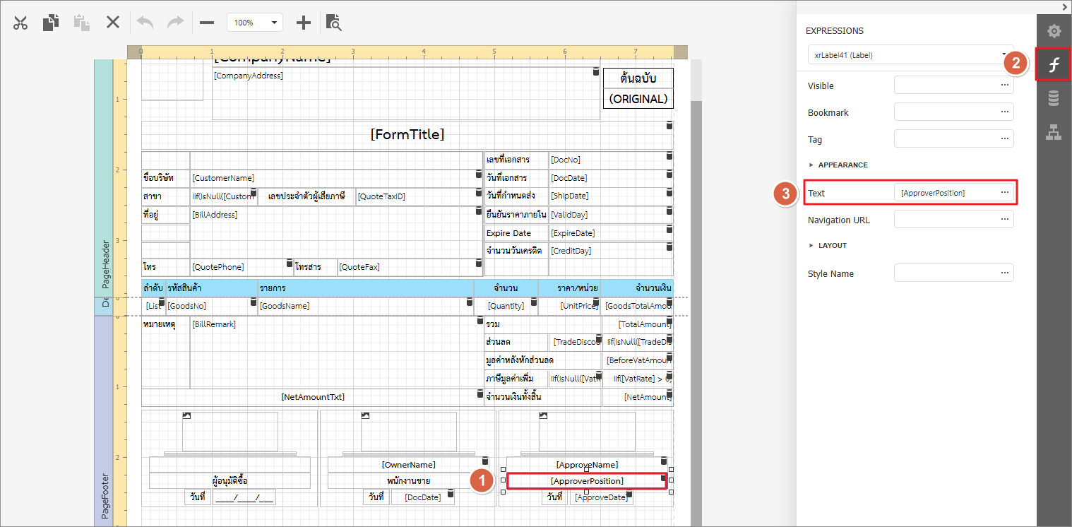 ตัวอย่างแบบฟอร์มใบเสนอราคา ส่วนของผู้อนุมัติบรรทัดตำแหน่งงานของผู้อนุมัติ โปรแกรมจะระบุ Fields ให้ดึงตำแหน่งงานมาจากตั้งค่าพนักงานอัตโนมัติ ซึ่งหากผู้ใช้ต้องการกำหนดให้ตำแหน่งงานนี้ขึ้นเป็นตำแหน่งเดิมเสมอโดยไม่เปลี่ยนตามพนักงาน เช่น ผู้จัดการฝ่ายขาย สามารถตั้งค่า Copy Design Form ดังนี้