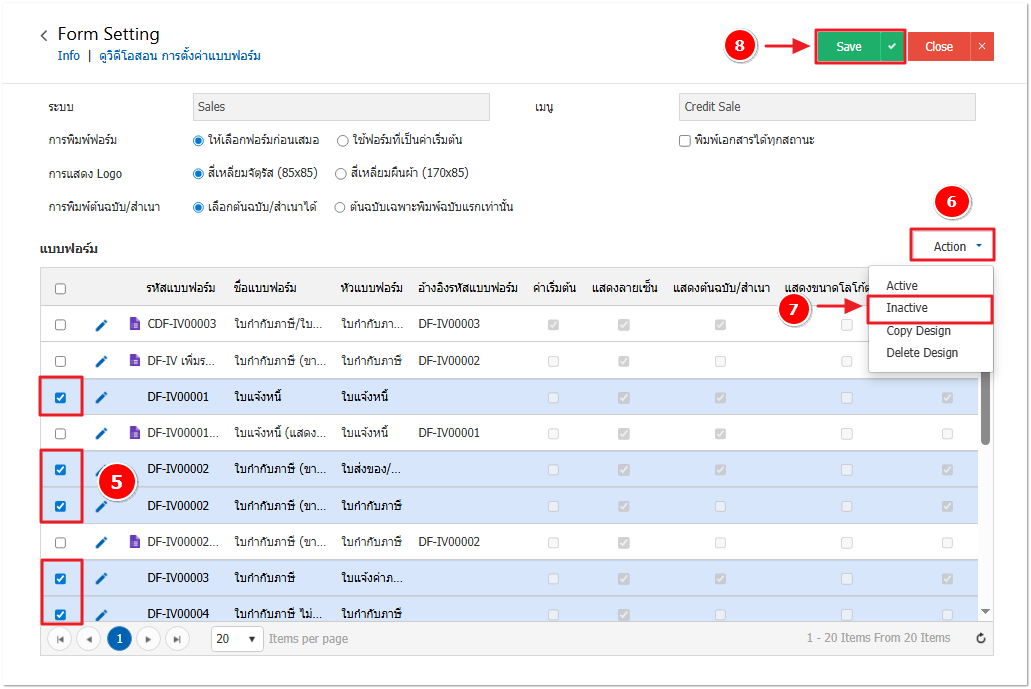3.จากนั้นให้ผู้ใช้กดติ๊กเลือกแบบฟอร์มที่ไม่ได้ใช้ > กด Action > Inactive เมื่อเรียบร้อยแล้วกดปุ่ม save ได้เลย