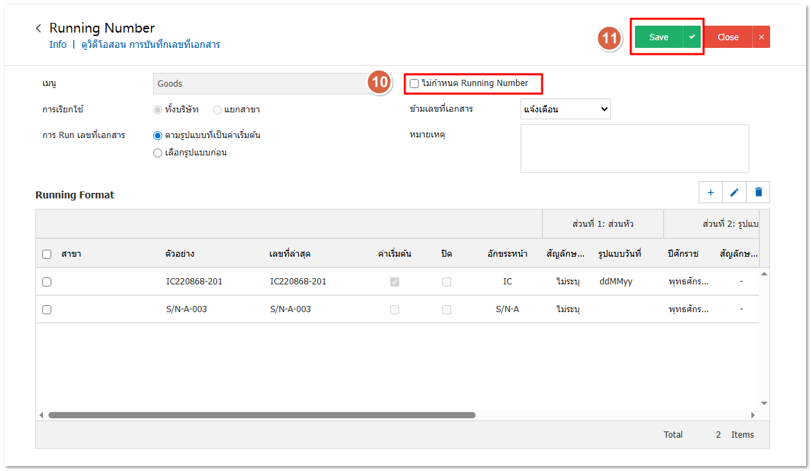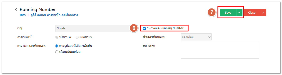 3. ทำการใส่เครื่องหมายเช็คถูกที่ช่องไม่กำหนด Running Number แล้วกดปุ่ม Save เพื่อบันทึกการเปลี่ยนแปลง