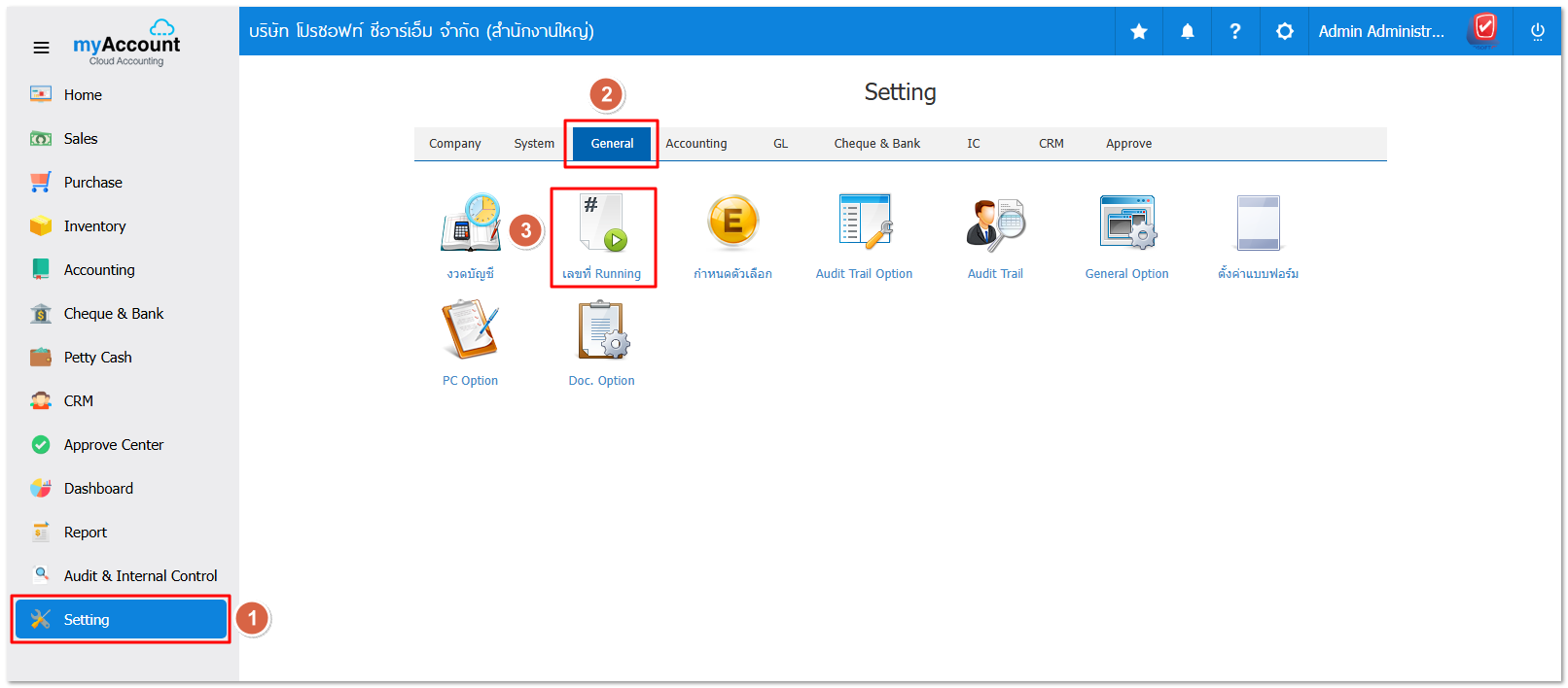 1. ผู้ใช้เข้าไปที่เมนู Setting > General > เลขที่ Running