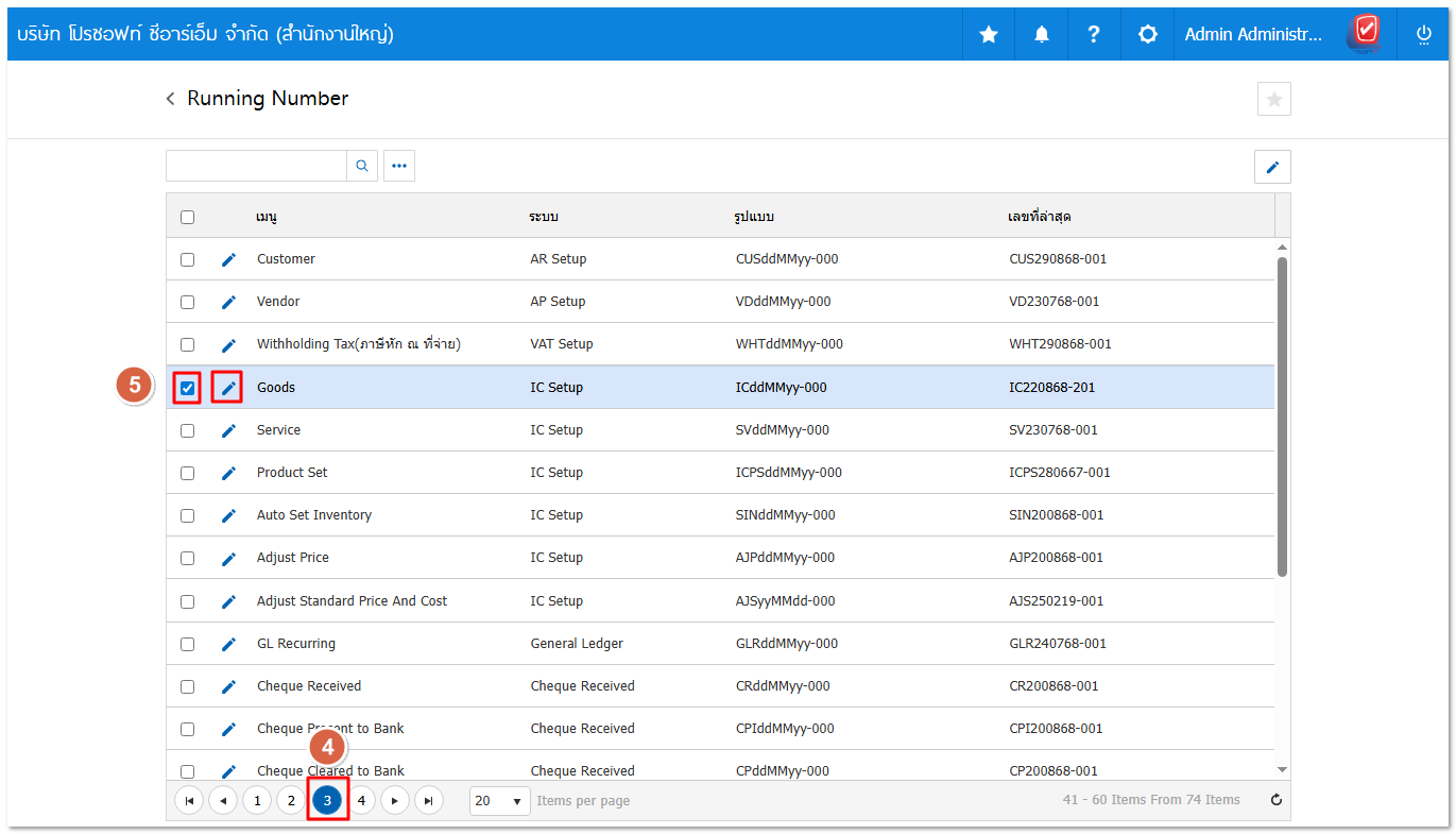 5. หลังจากแก้ไขรหัสสินค้าใหม่แล้ว ต้องการให้ระบบ Running รหัสสินค้าให้เหมือนเดิม สามารถกลับไปแก้ไขที่ Setting > General > เลขที่ Running > หน้าที่ 3 > Goods นำเครื่องหมายเช็คถูกออกหน้าช่อง ไม่กำหนด Running Number เพื่อให้โปรแกรมรันรหัสสินค้าปกติ แล้วกดปุ่ม Save เพื่อบันทึกการรันรหัสสินค้าให้เป็นแบบเดิม