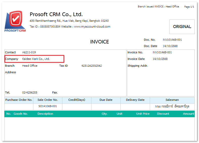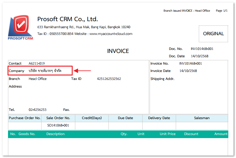 กรณีผู้ใช้ ใช้งานโปรแกรมภาษาอังกฤษแต่แบบฟอร์มใบกำกับภาษีแสดงชื่อลูกหนี้เป็นภาษาไทย ดังตัวอย่างรูปภาพข้างต้น สามารถแก้ไขได้ดังนี้