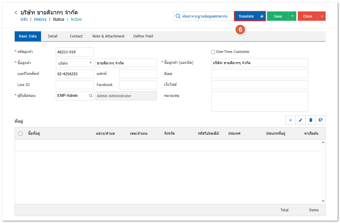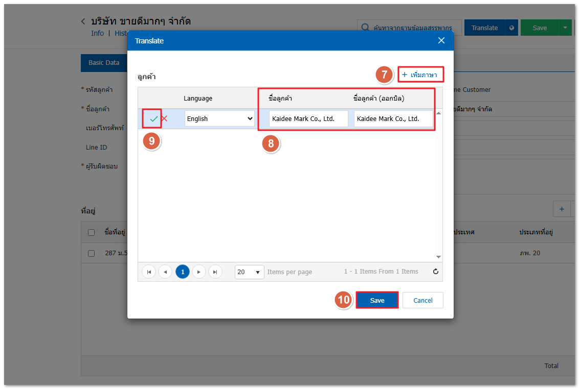 4. โปรแกรมจะแสดงหน้า Translate ให้กด + เพิ่มภาษา > ระบุชื่อลูกค้าและชื่อลูกค้าออกบิลภาษาอังกฤษ >