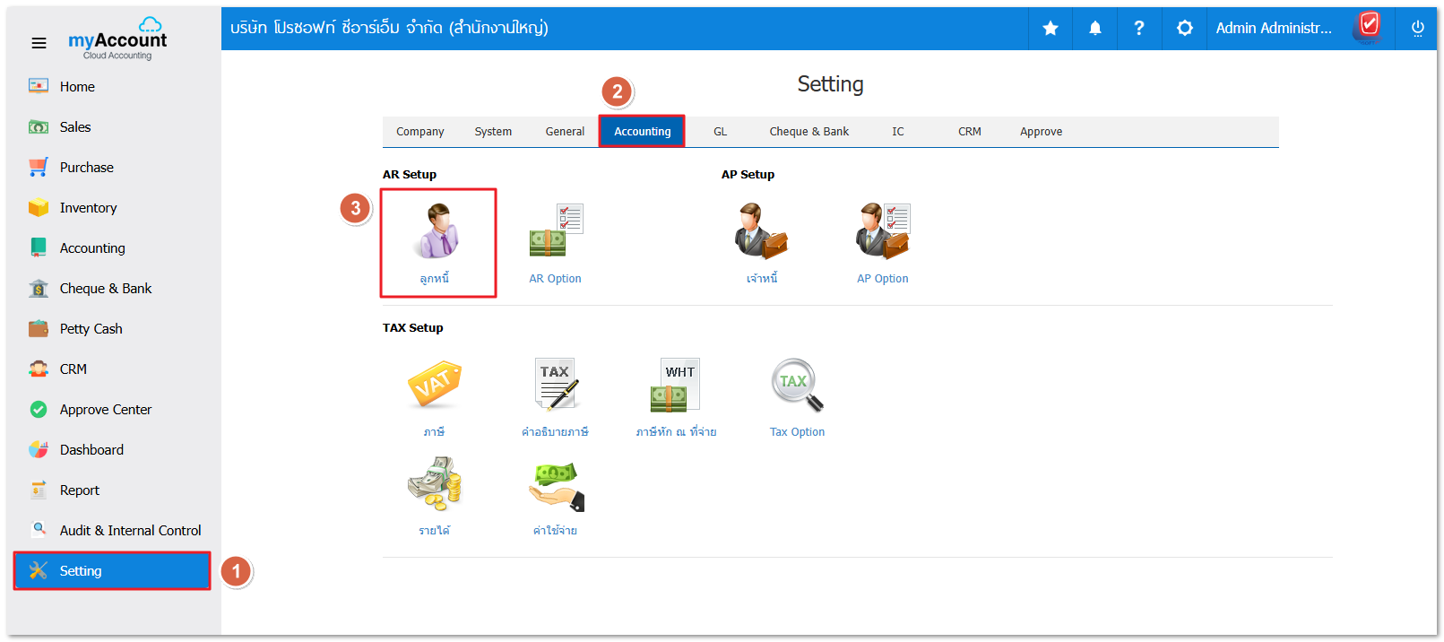 1. ให้ผู้ใช้ไปที่ Setting > Accounting > ลูกหนี้