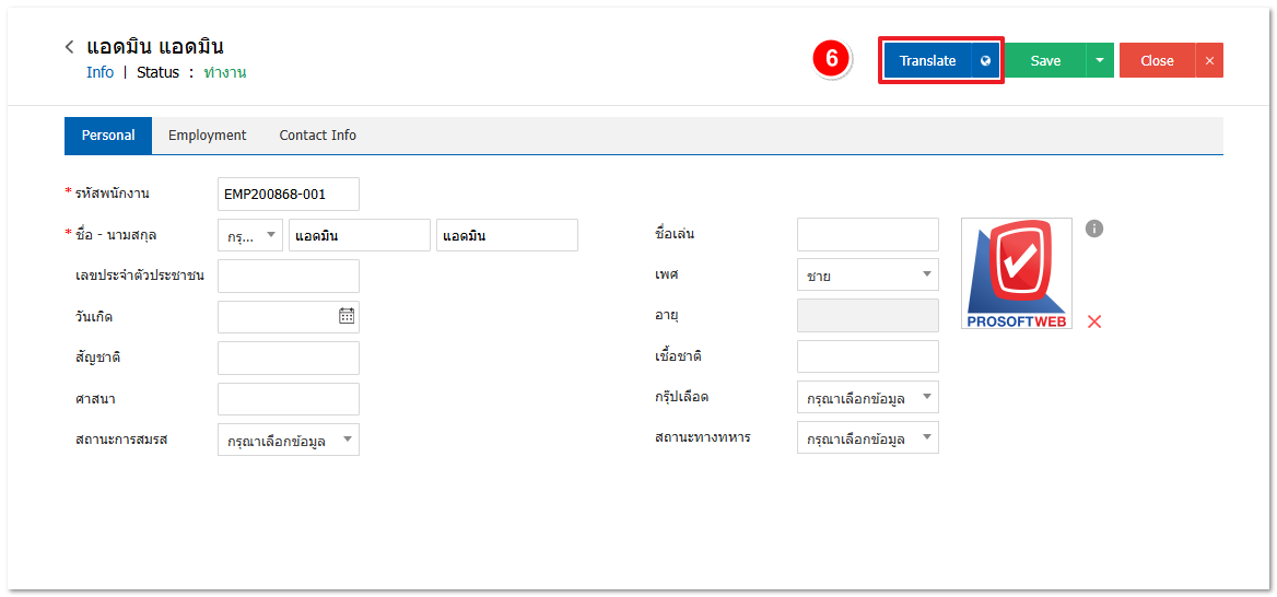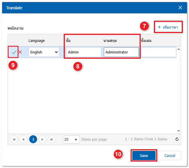 4. โปรแกรมจะแสดงหน้า Translate ให้กด + เพิ่มภาษา > ระบุชื่อชื่อ-นามสกุลพนักงานภาษาอังกฤษ > กด