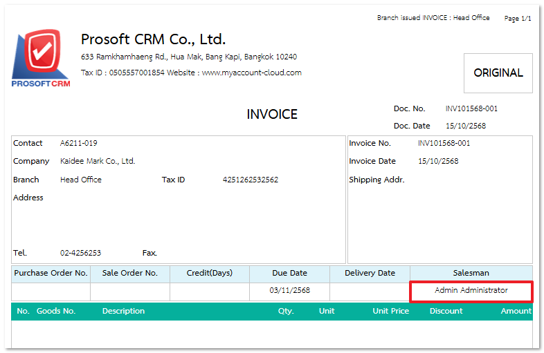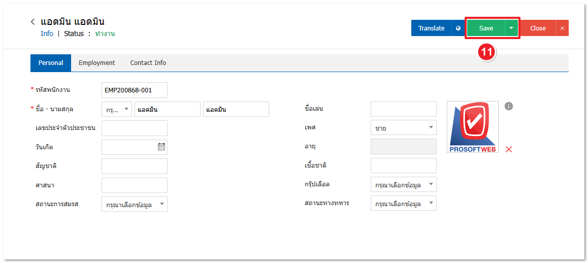 5. จากนั้นบันทึกข้อมูลพนักงานได้เลย เมื่อผู้ใช้ไปดูแบบฟอร์มใบกำกับภาษีภาษาอังกฤษจะแสดงชื่อพนักงานผู้รับผิดชอบเป็นภาษาอังกฤษให้