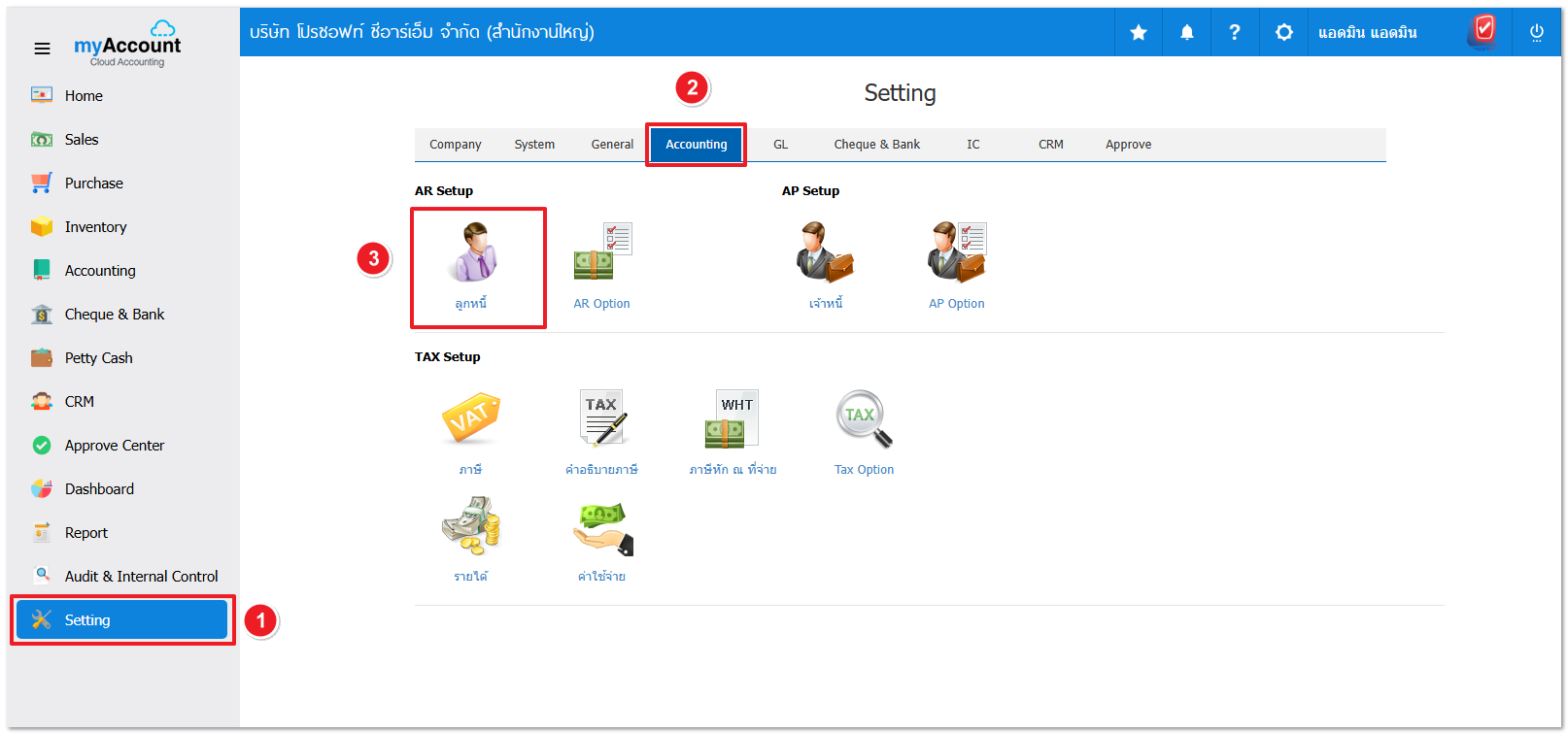 1. ให้ผู้ใช้ไปที่เมนู Setting > Accounting > ลูกหนี้