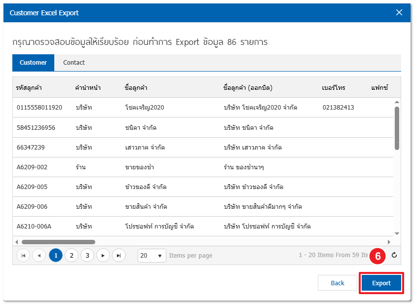 4. จากนั้นกด Next โปรแกรมจะแสดงหน้าต่างตรวจสอบข้อมูลลูกค้า ผู้ใช้สามารถกด Export ได้เลย ระบบจะแสดง Export ข้อมูลสำเร็จกด OK เพื่อตรวจสอบไฟล์ Excel ได้เลย