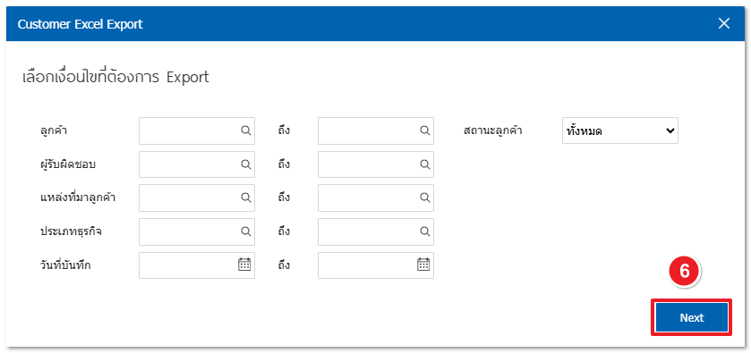 3. โปรแกรมจะแสดงหน้าต่าง "Customer Excel Export" เพื่อให้ผู้ใช้งานสามารถกำหนดเงื่อนไขการกรองข้อมูลได้ดังนี้