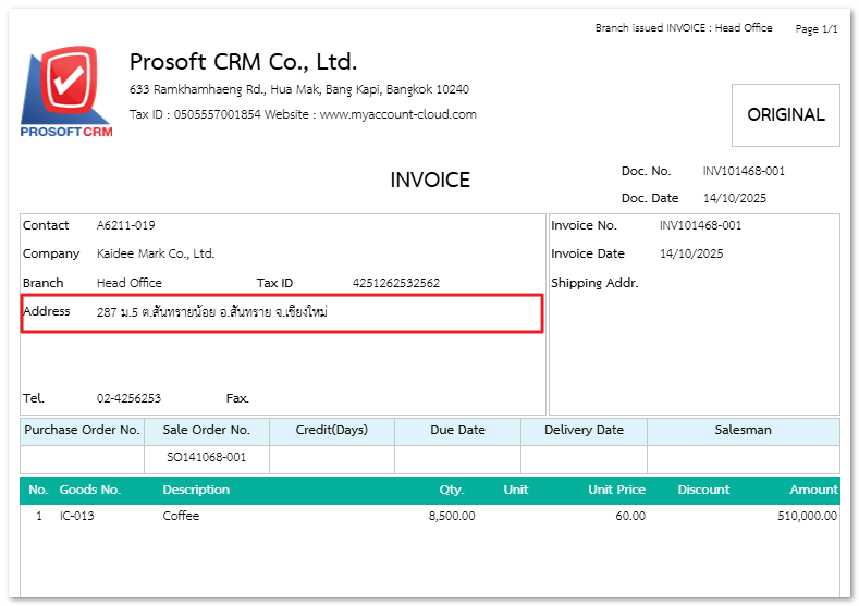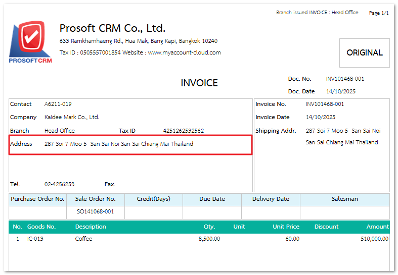 กรณีผู้ใช้ ใช้งานโปรแกรมภาษาอังกฤษแต่แบบฟอร์มใบกำกับภาษีแสดงที่อยู่ของลูกหนี้เป็นภาษาไทย ดังตัวอย่างรูปภาพข้างต้น สามารถแก้ไขได้ดังนี้