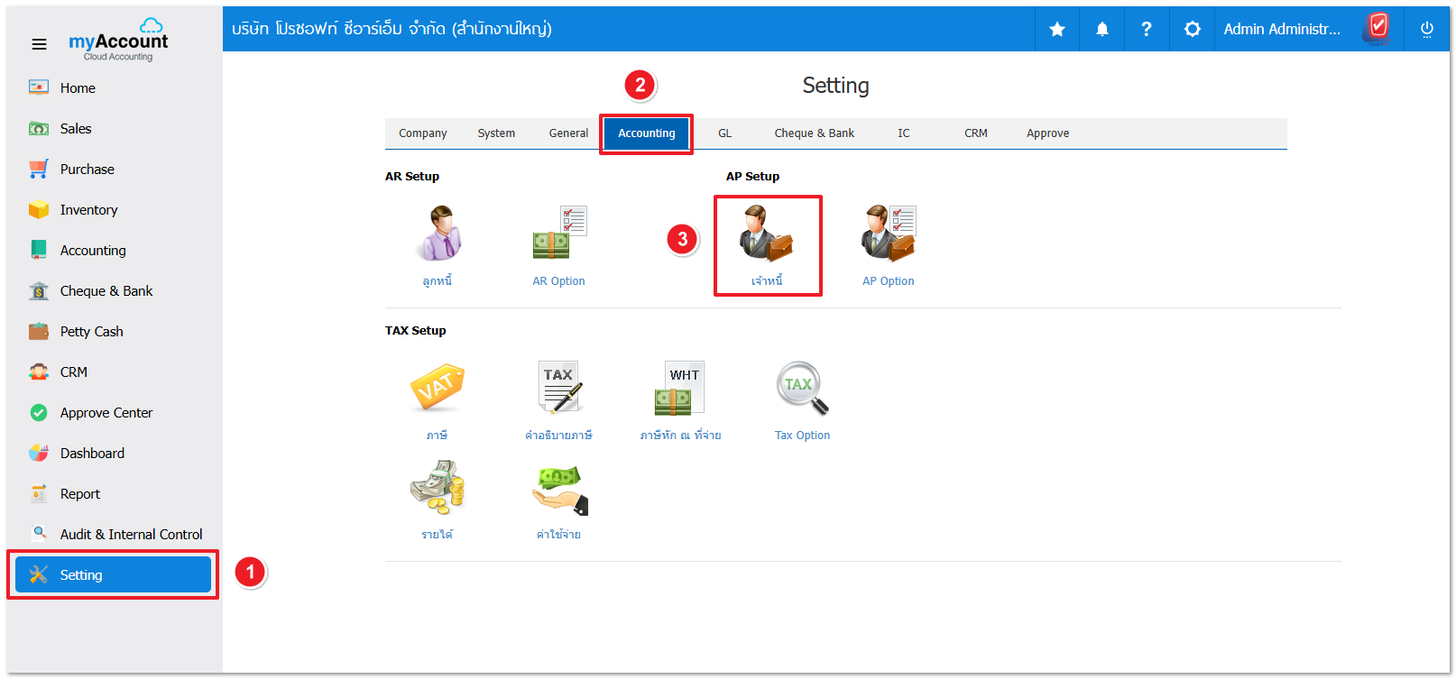 1. ให้ผู้ใช้ไปที่เมนู Setting > Accounting > เจ้าหนี้