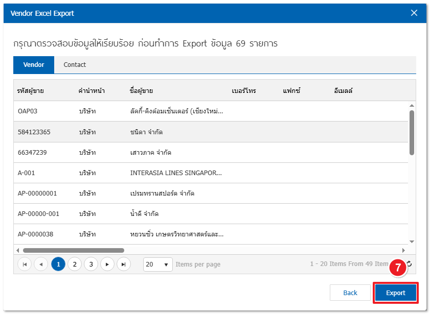กรณีที่ผู้ใช้ต้องการ Export ข้อมูลเจ้าหนี้ทั้งหมดออกมาจากระบบเพื่อตรวจสอบรายละเอียดต่างๆ สามารถทำการ Export ได้ดังนี้