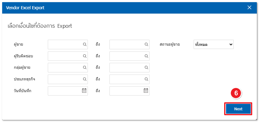 ผู้ขาย : ผู้ใช้งานสามารถเลือกกำหนดรหัสผู้ขายที่ต้องการ Export ได้ตามต้องการ หรือไม่กำหนดเพื่อ Export ผู้ขายทั้งหมด